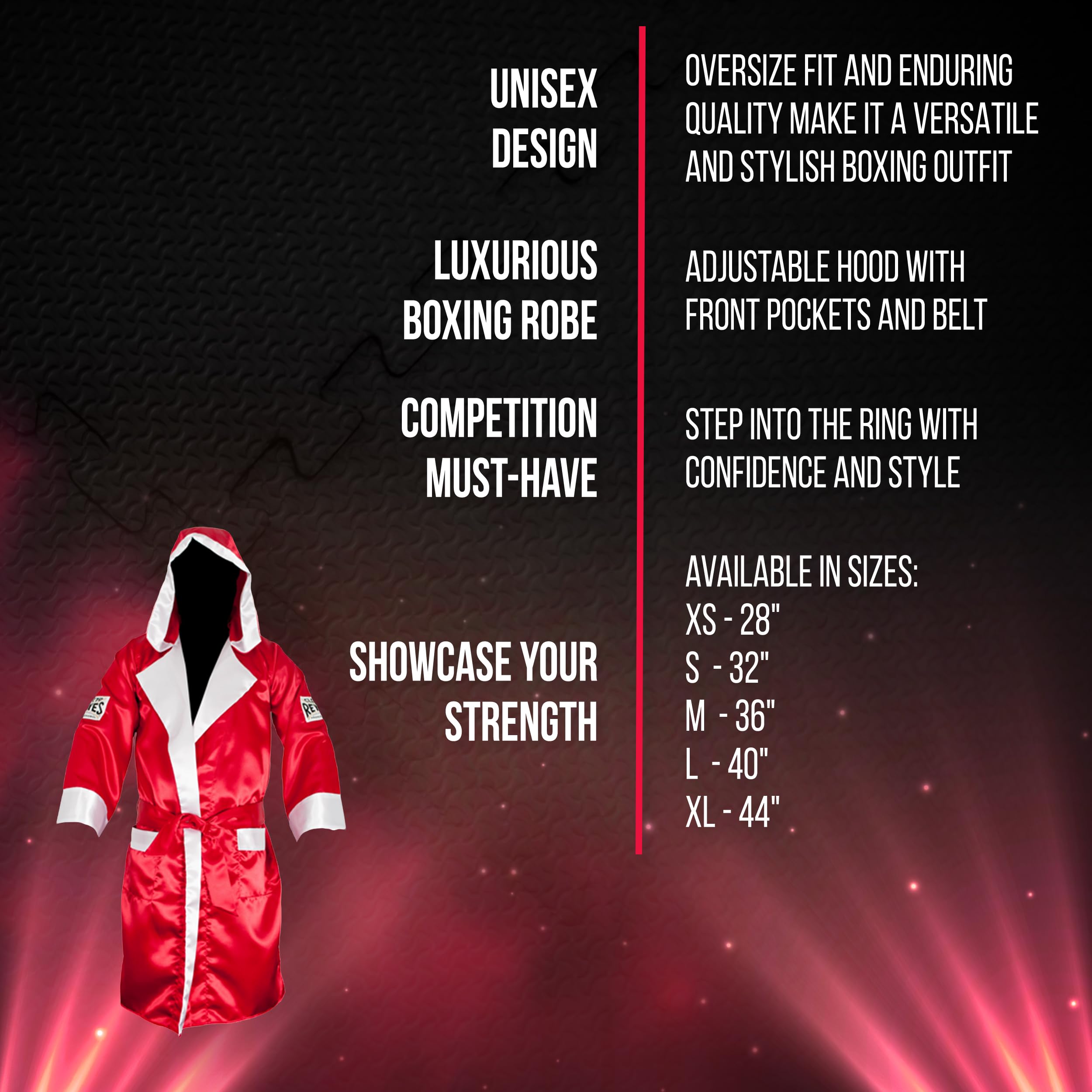 - LUXURIOUS SATIN BOXING ROBE - CLETO REYES designed, Mexican-made, with adjustable hood for custom coverage. Competition robe with front pockets and belt for the perfect fit.